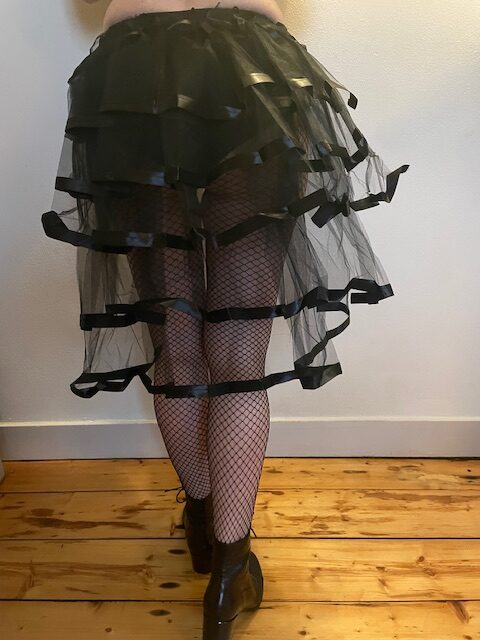 De achterkant van de lange petticoat bestaat uit laagjes tule die met glanzende bies zijn afgezet. In de taille zit een elastische band.