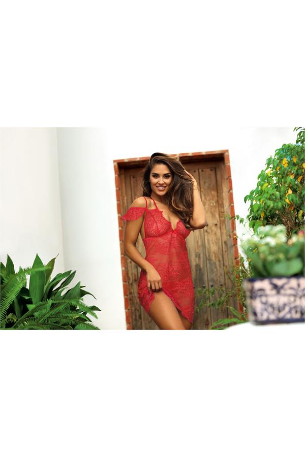 Het is nog aantrekkelijker dankzij de delicate mouwtjes, die als kleine vleugels de lichtheid van de structuur benadrukken. Het wordt in de nek vastgebonden en heeft verstelbare bandjes. Inclusief een stringetje gemaakt van hetzelfde rode kant