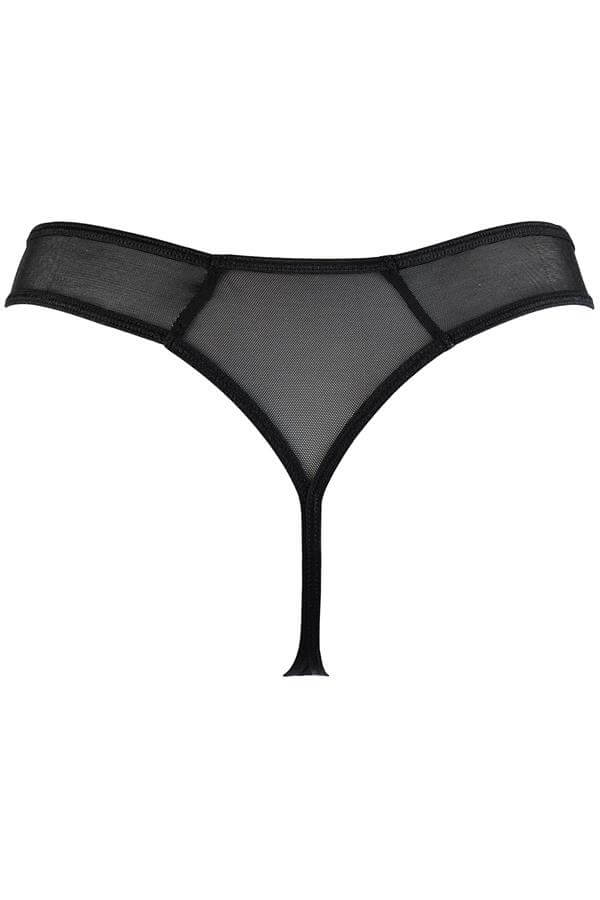 Charmante string van comfortabel gaas met kanten inzetten waarin blauwe accenten opvallend glinsteren in het zwart.