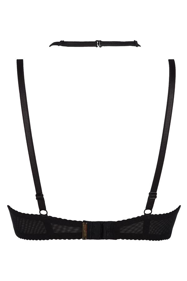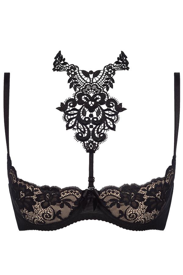 Deze open cup BH is subtiel en romantisch en gemaakt van klassiek zwart kant. De cups zijn voorzien van beugels en gevoerd. De prachtige choker van kant is verstelbaar en kan er ook afgehaald worden.
