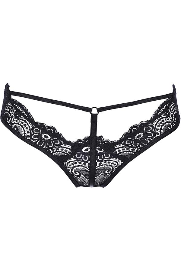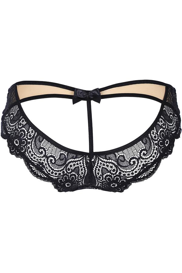Prachtige kanten slip die een waanzinnig mooie opengewerkte achterkant heeft. Het wordt afgemaakt met een subtiel strikje. De voorkant heeft nog een opvallende strap.