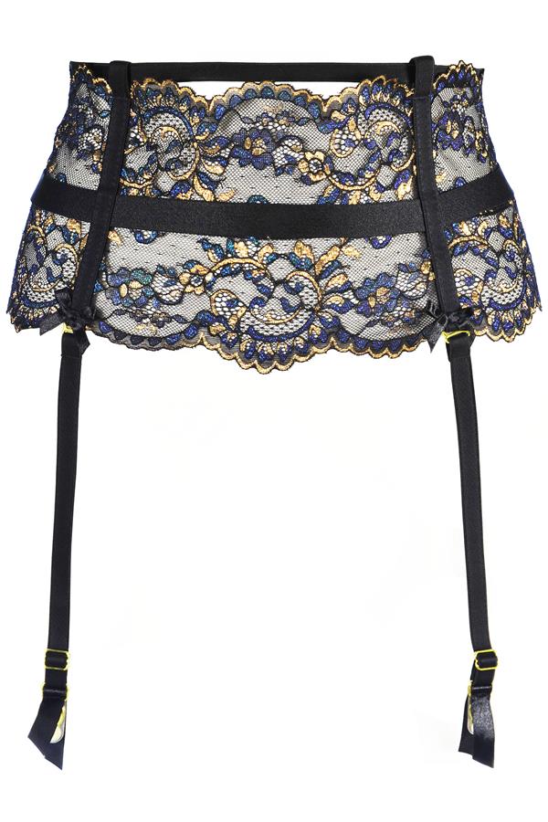 Sprookjesachtige taille gordel van kant met glimmende blauwe en gouden accenten. De gouden accenten komen ook terug in alle metalen haakjes wat een luxe uitstraling geeft. De jarretels zijn elastisch en de baleinen flexibel waardoor het geheel erg comfortabel zit. De sluitingen op de rug zijn verstelbaar en elastisch.