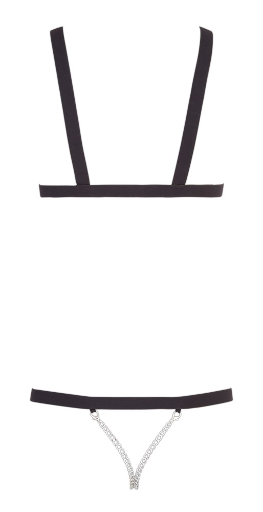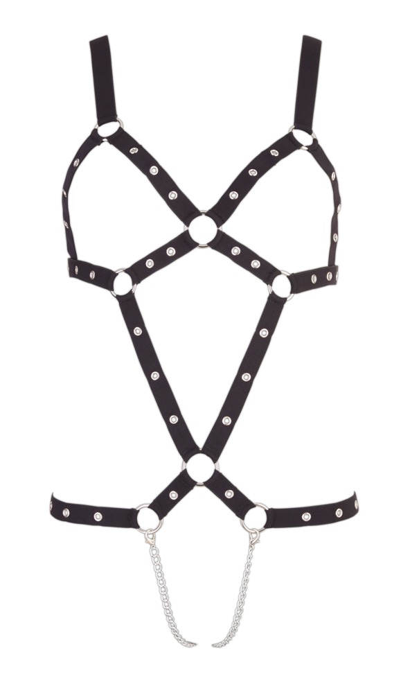 Met deze zwarte strap body harnas van straps zijn hete bondage spelletjes intens! Vooral prikkelend zijn 2 verwijderbare metalen kettingen die door het kruis lopen.