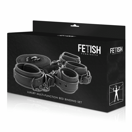 Deze set bestaat uit straps die je over het bed spant en de bijbehorende hand – en enkelboeien maak je daaraan vast.