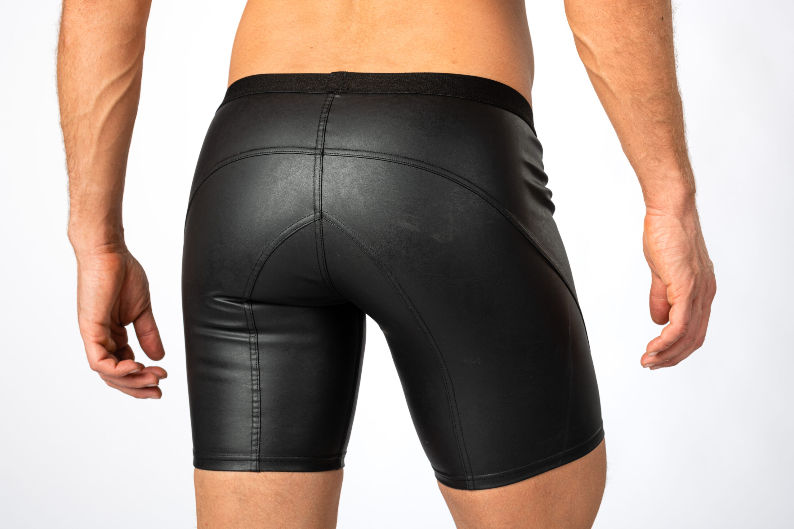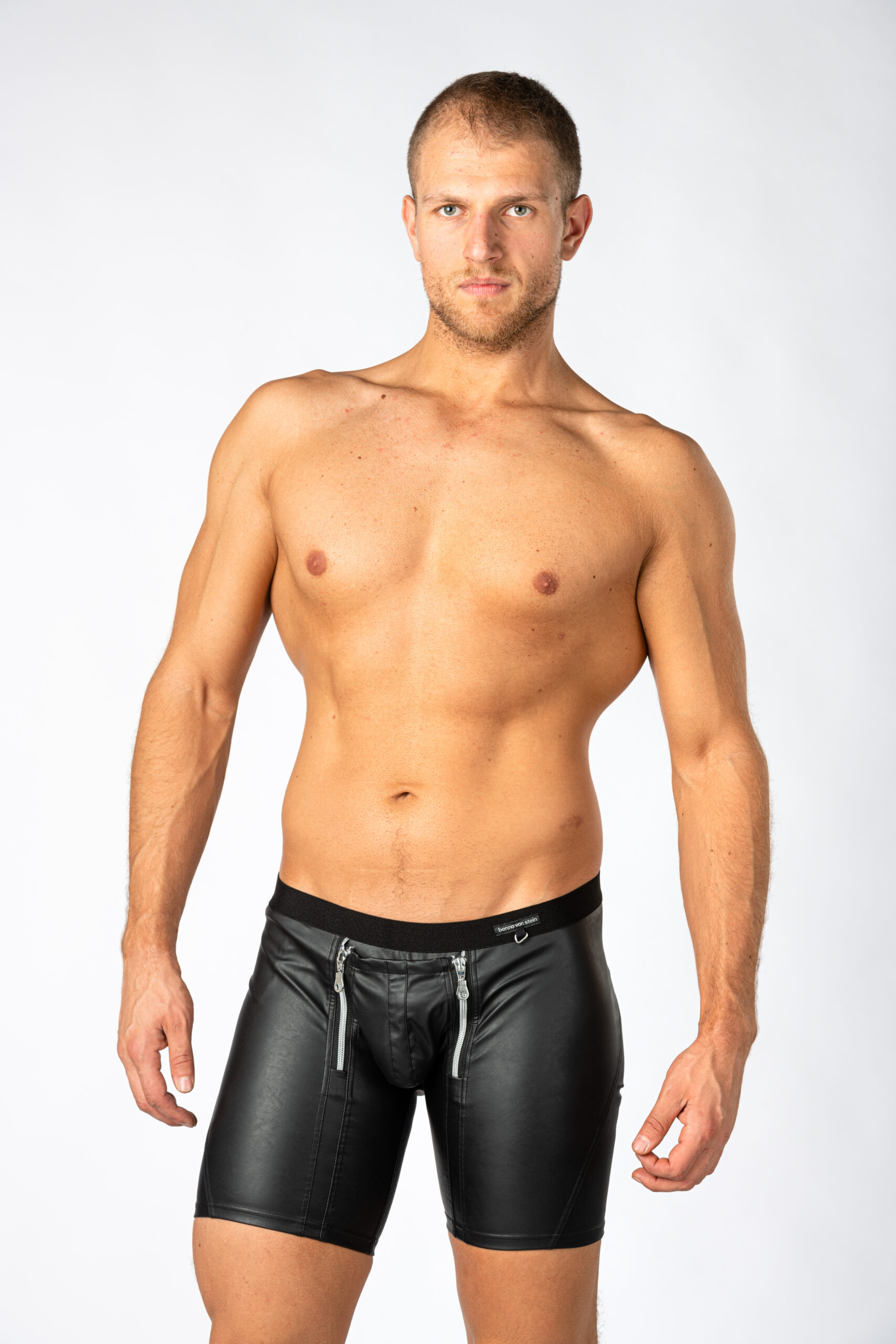 Bermuda van zacht kunstleer voor een zeer aangenaam draaggevoel, met een iets langere pijp en 2 zilverkleurige ritsjes aan de voorkant om de pouch te openen.