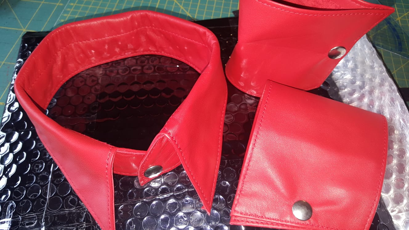 Stoere rode overhemdkraag met bijpassende rode manchetten die perfect gecombineerd kan worden met heel veel (pu) leren outfits.