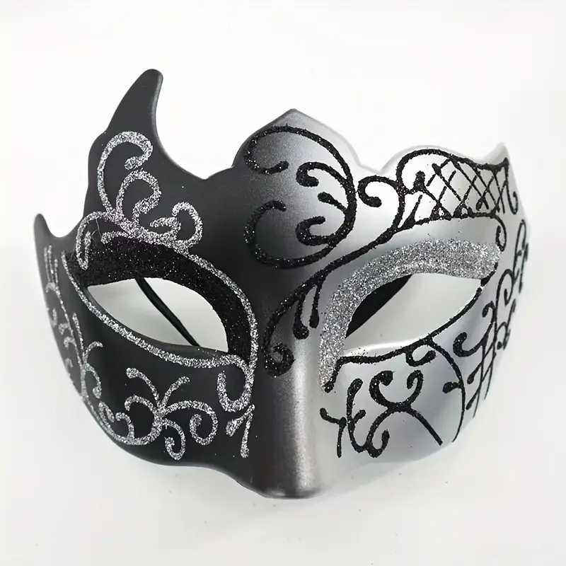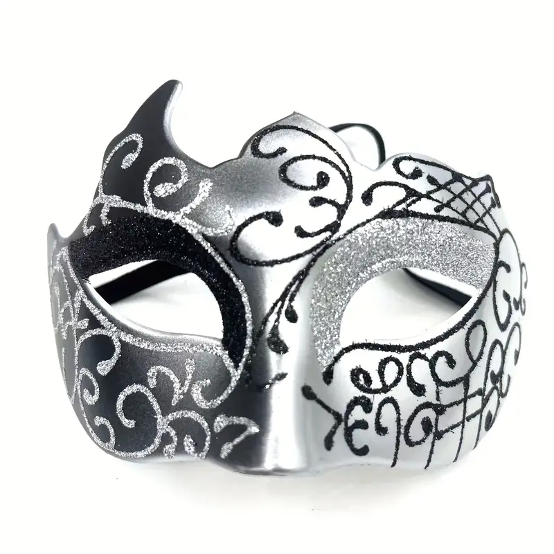 Het masker is asymmetrisch vormgegeven en subtiel versierd met verfijnde patronen. De combinatie van zwarte en zilveren glitterdetails geeft het geheel een elegante en opvallende uitstraling – perfect voor wie zich wil onderscheiden tijdens een gemaskerd feest.
