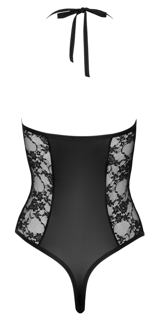 Deze supersexy string body combineert een classy matte wetlook met delicaat kant. De rug is vrij aan de bovenkant en via de haltersluiting wordt deze vastgeknoopt in de nek. Deze body is extra hoog uitgesneden bij de benen/heupen waardoor jouw benen nog langer lijken. Het resultaat is een adembenemende party body.