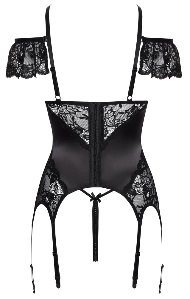 Cottelli Collection – Bustier Set met Jarretelles en Open Kruis String – Wetlook – Kant – Zwart