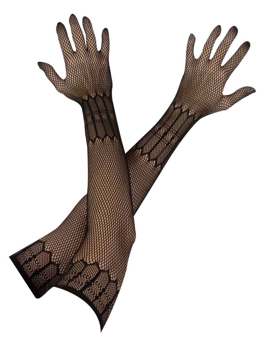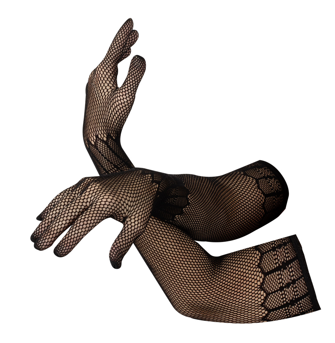 Mooie lange visnet handschoenen met een ingeweven motief op pols en boord. Deze handschoenen vormen een spannende combinatie met bijvoorbeeld een visnet body of visnet kousen. Maakt je outfit helemaal af!