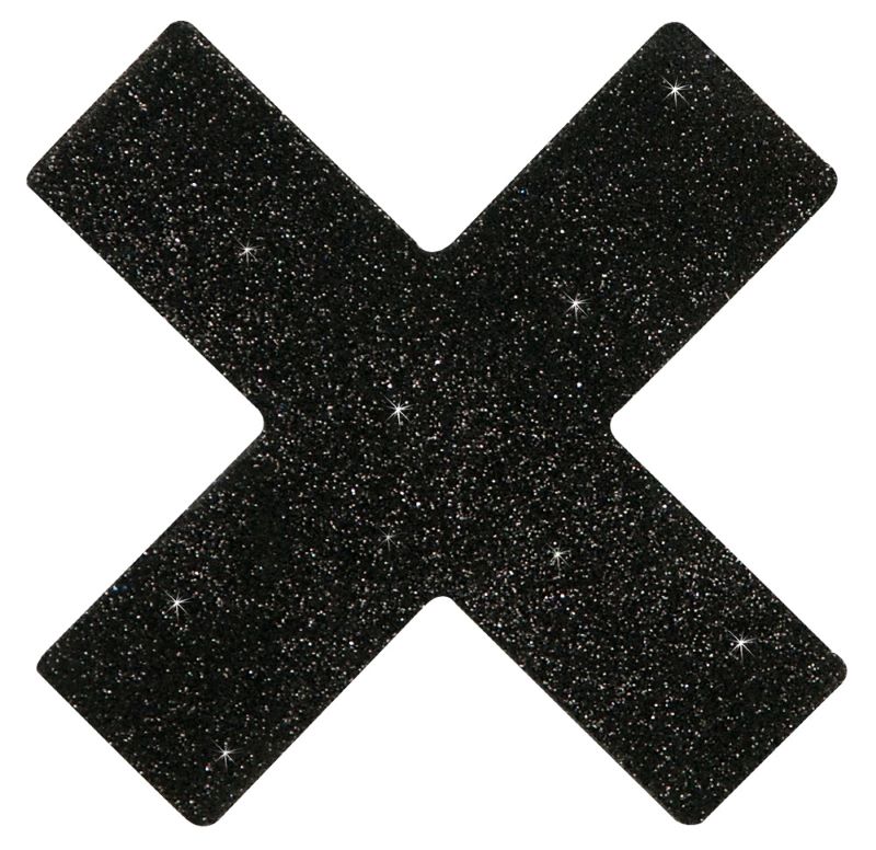 Tepelplakkers in kruisvorm en bedekt met glitters. In elke verpakking zitten 2 tepelplakkers.