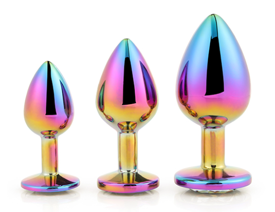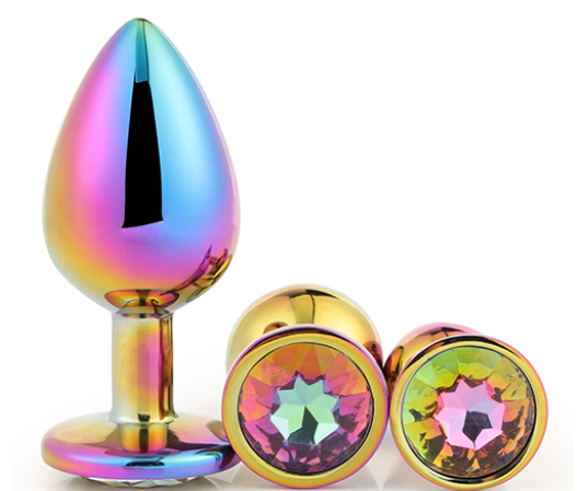 Deze multicolour anaal plug set bestaat uit 3 maten, elk met een ronde edelsteen. Gemaakt van glad naadloos aluminium zodat ze gemakkelijk glijden. De aluminium pluggen kunnen voor gebruik verwarmd of gekoeld worden in water voor extra sensaties.