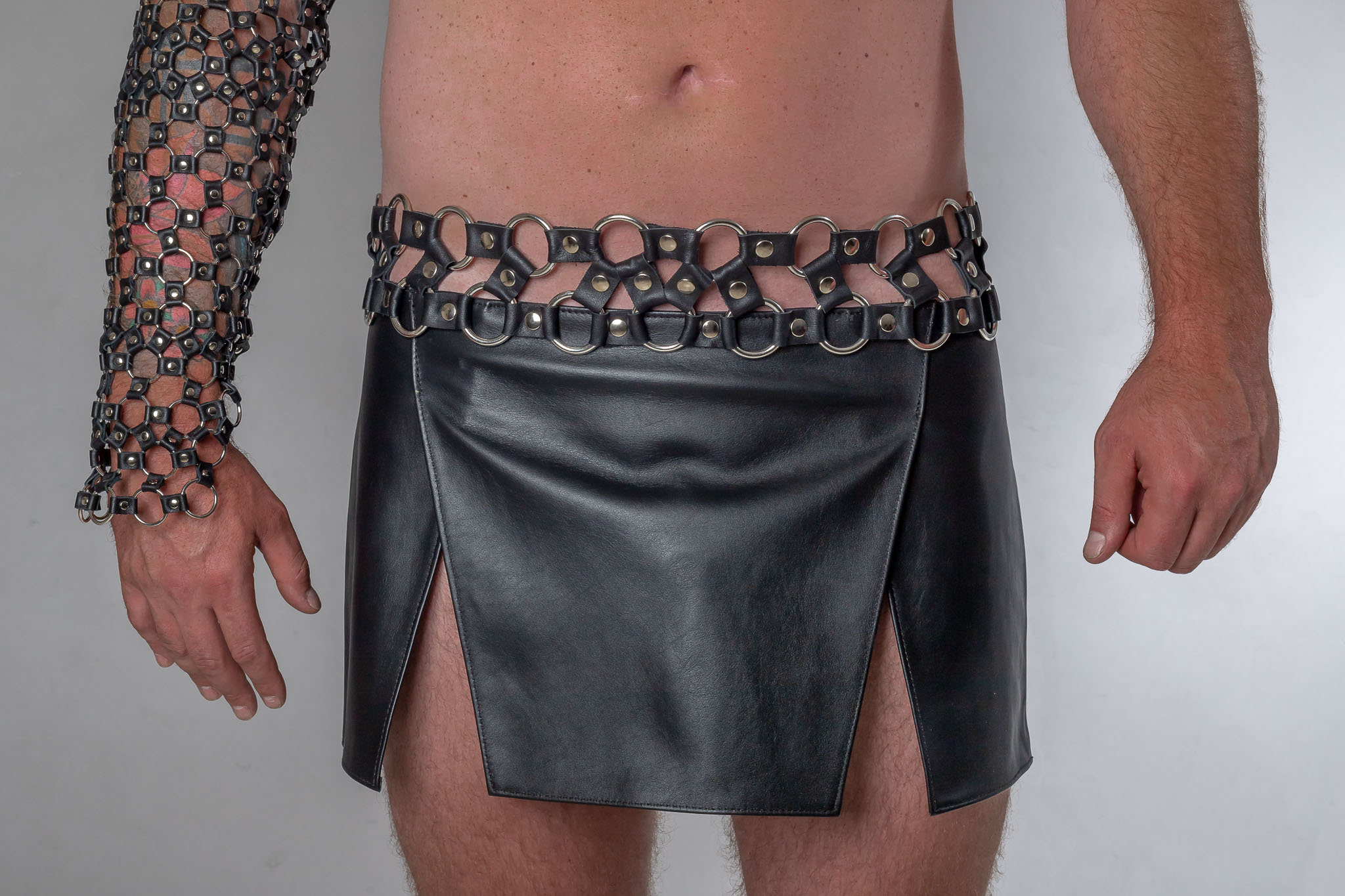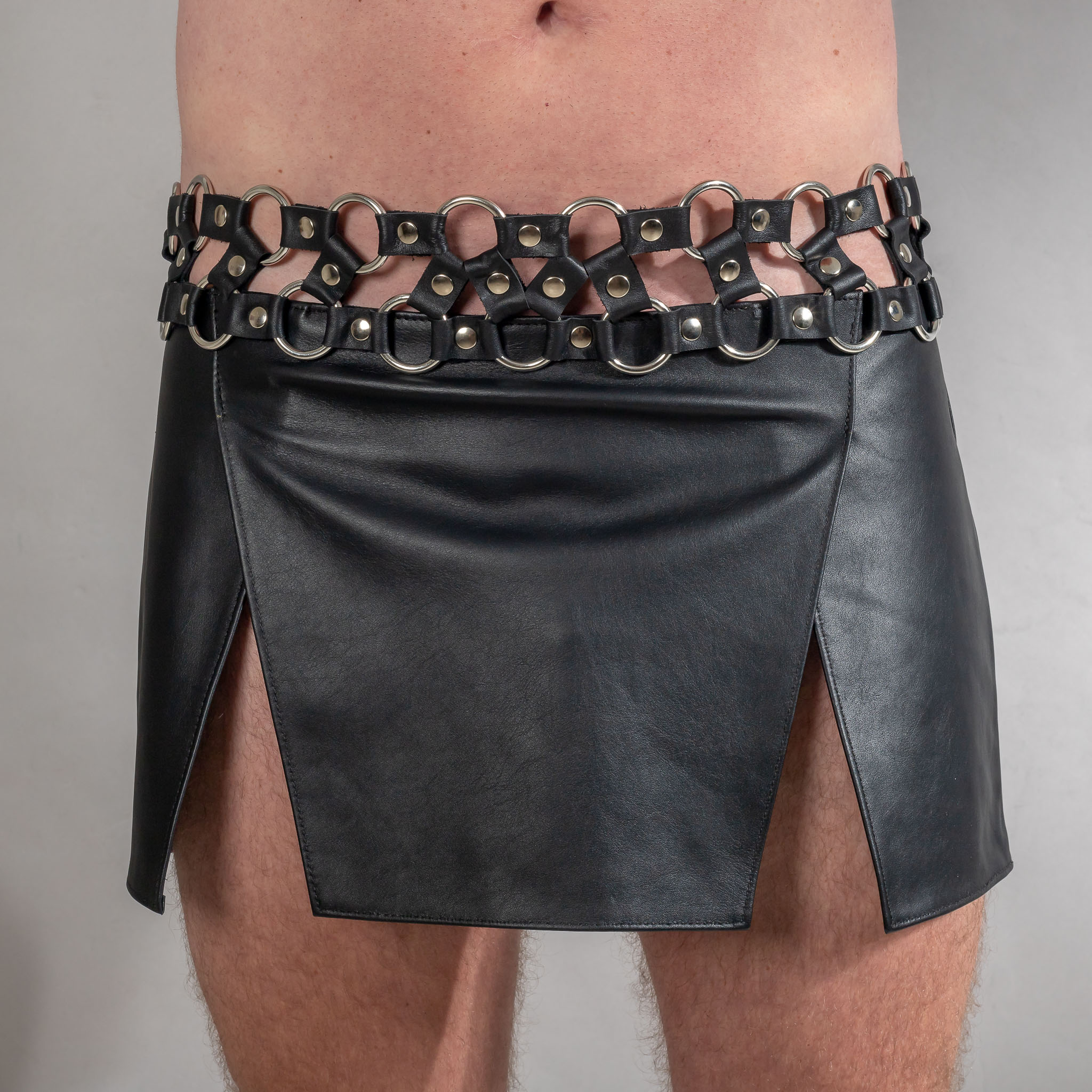 Stoere heren gladiator rok met 4 flappen. De bovenkant is gemaakt van 2 rijen nikkelvrije ringen met leertjes.