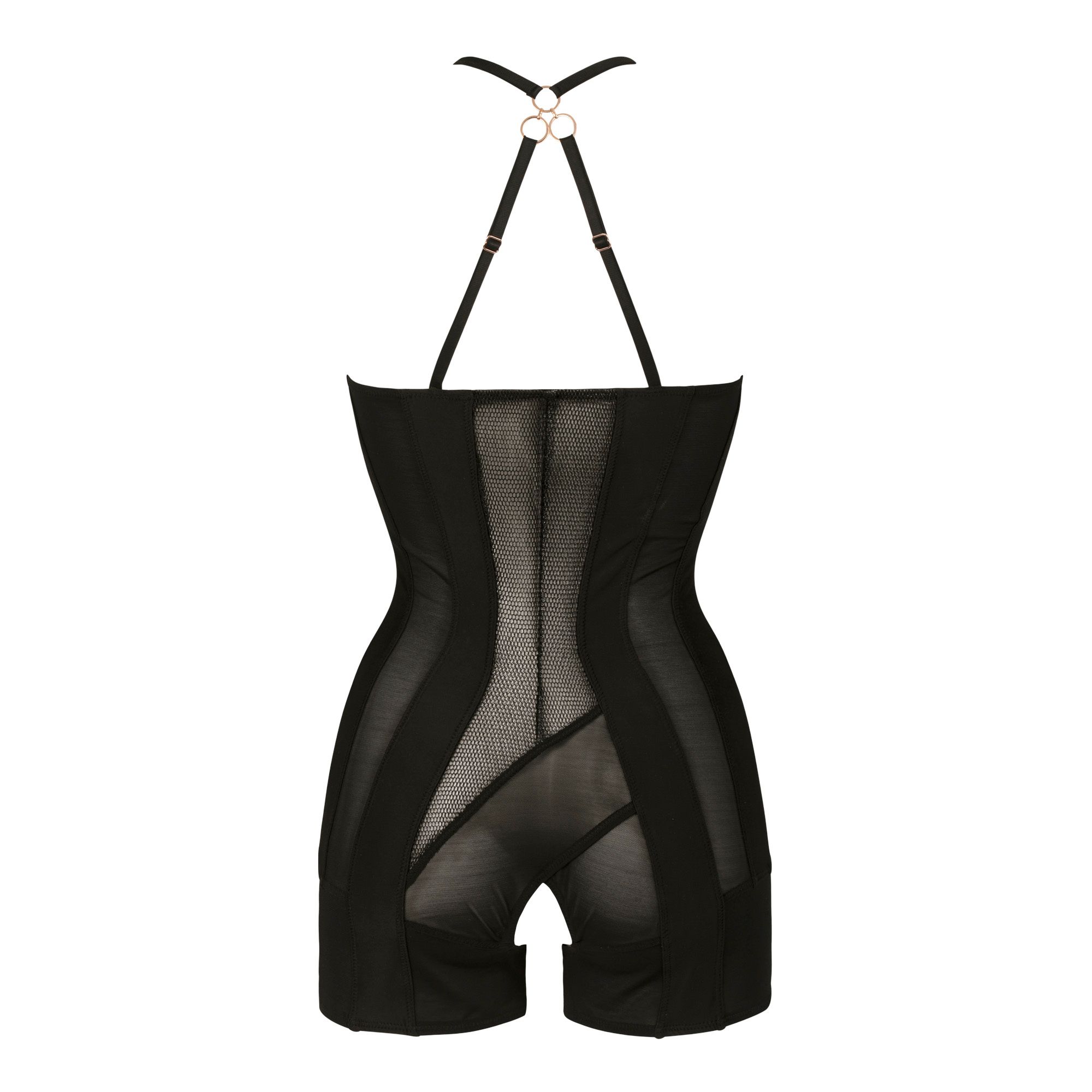 Deze shapewear is gemaakt van mesh met zilverkleurige accenten en lycra, twee onthullende stoffen die je rondingen zullen benadrukken. De playsuit heeft een rits aan de voorkant en een open kruisje. De bandjes op de rug zijn verstelbaar.