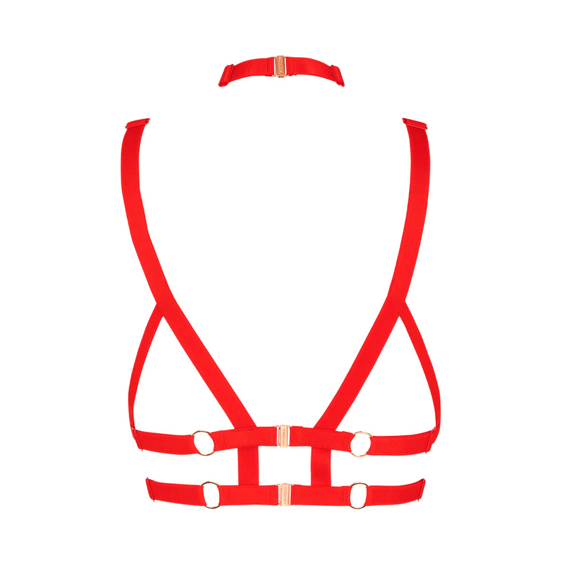 Het model draagt de harnas top met de Cherie Tanga Rouge string en het Serguei been/heup harnas.