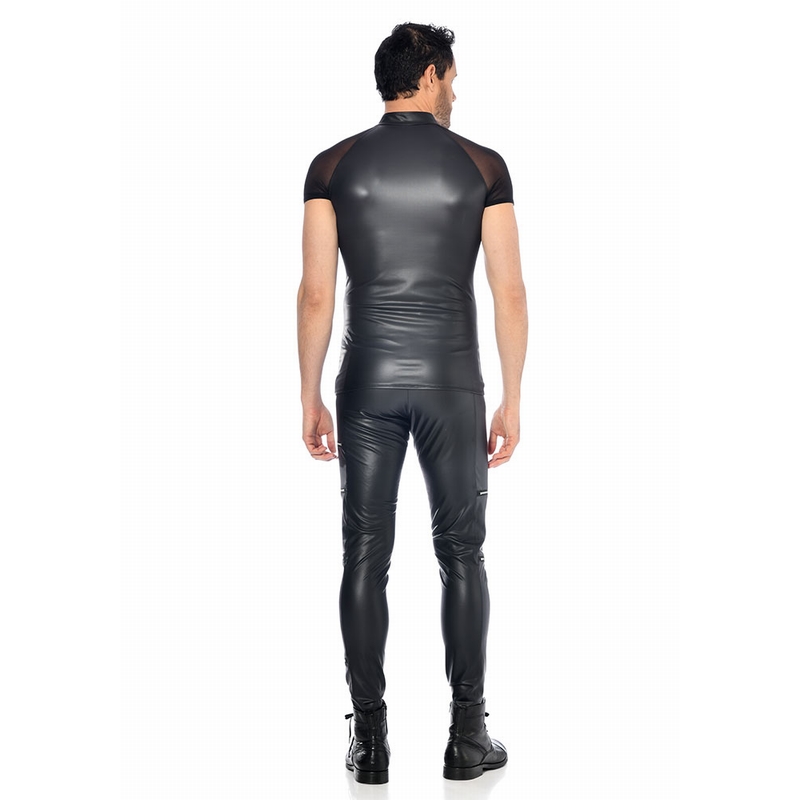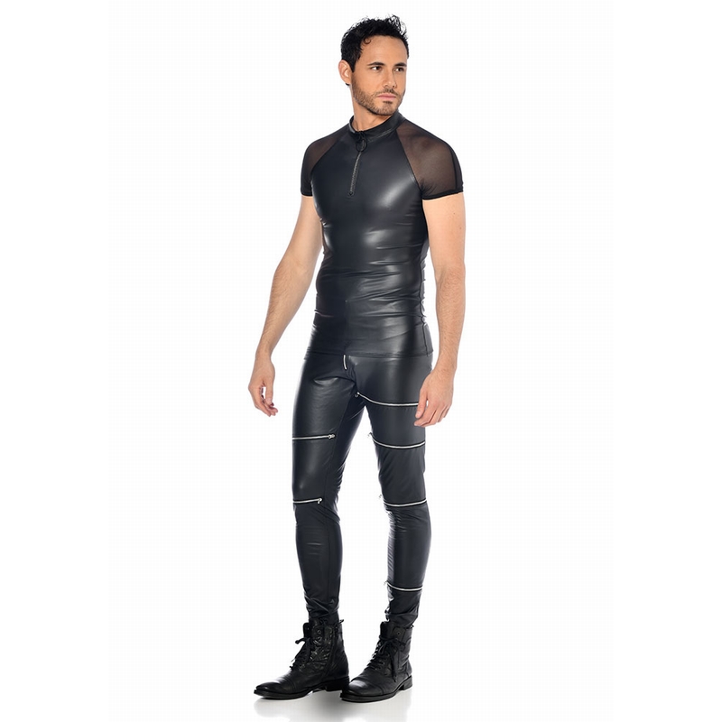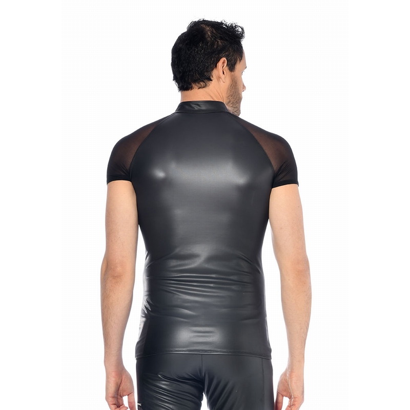 Dit shirt heeft een opvallende zilveren rits in de hals en gaas mouwtjes. Het zwarte wetlook is mat met een zijdeachtige afwerking.