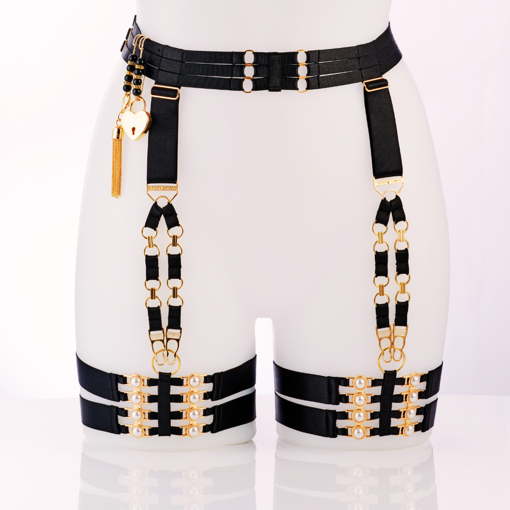 Kinky Diva – Decadence – Isis II – Parels – Gouden Details – Jarretelgordel – Harnas – Zwart