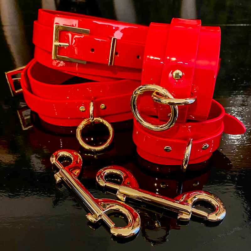 Stijlvol, krachtig en volledig in control – deze complete bondage set uit de Kinky Diva collectie is gemaakt van glanzend rood lak met goudkleurige accenten. De combinatie van high gloss vegan leer en classy metalen details maakt deze set een echte eyecatcher voor elke dominatrix of kinky liefhebber.