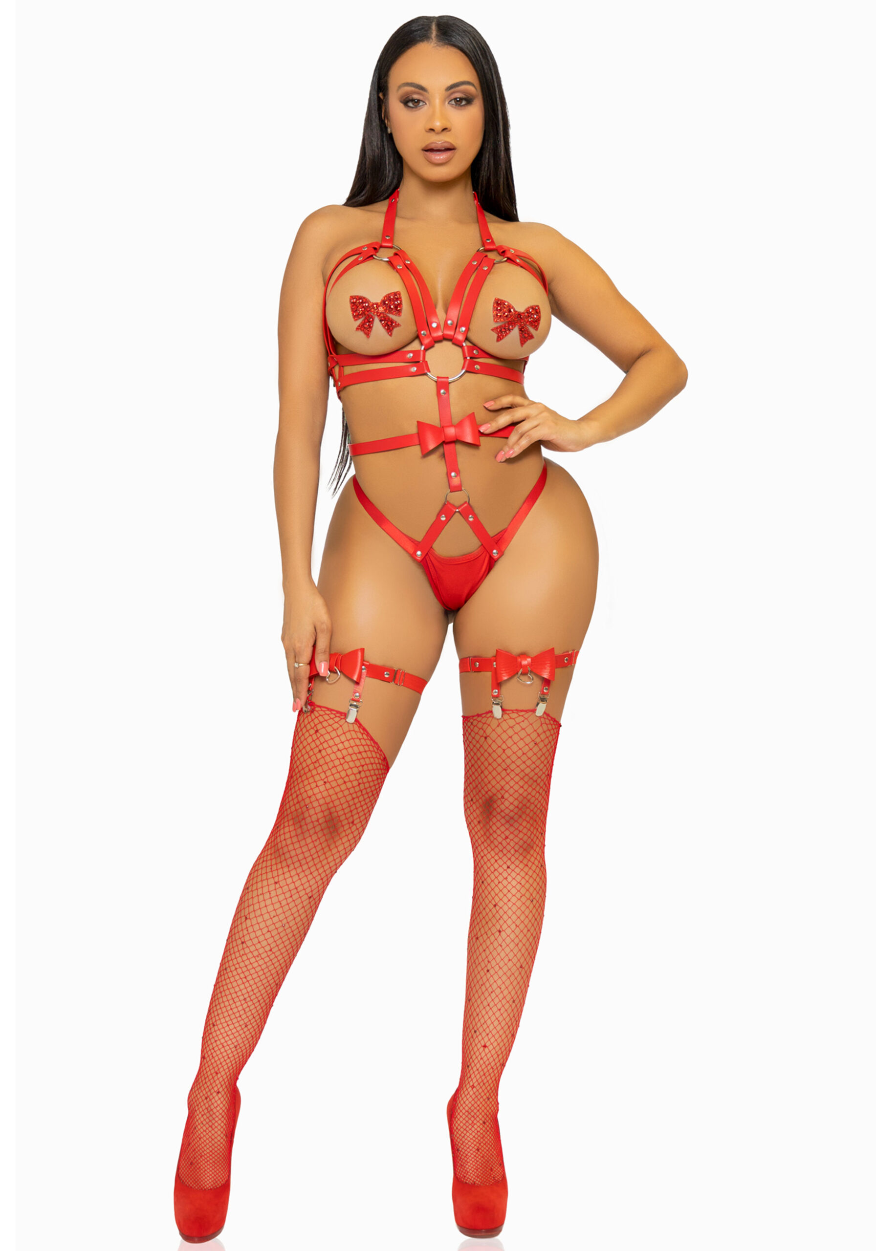 Let op: Op enkele foto's is het harnas afgebeeld met string, beenjarretels, tepelplakkers of visnet body, deze worden NIET meegeleverd.