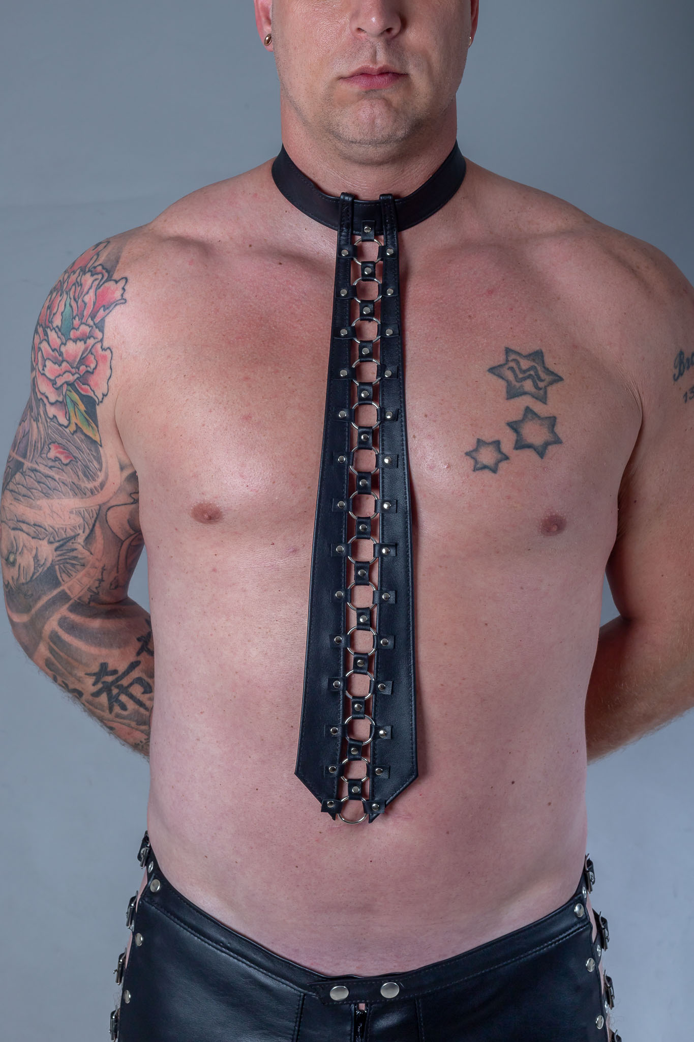 Deze stoere stropdas is gemaakt van zacht lamsleer met een rij van nikkel vrije ringen in het midden. De stropdas sluit achter met een gesp. Kan ideaal gecombineerd worden met heel veel outfits. Kinky met een knipoog!