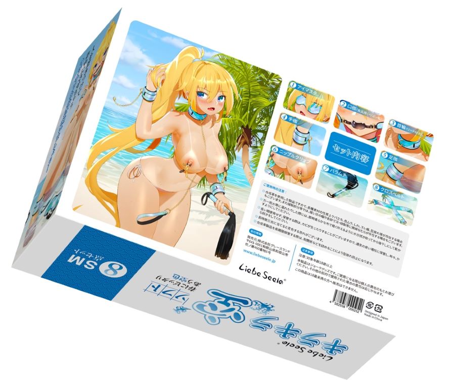 De 8-delige bondage set in glimmend licht blauw. De metalen onderdelen en accessoires zijn goudkleurig. Een bijzondere uitgebreide set voor beginners in de BDSM. Ook een perfect kadootje!