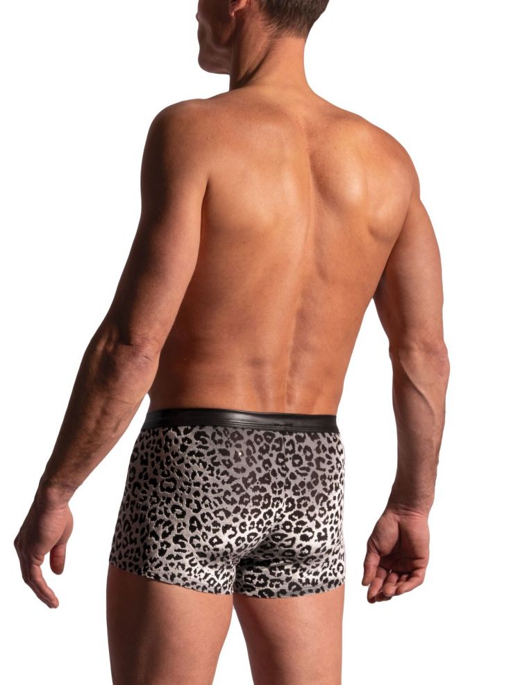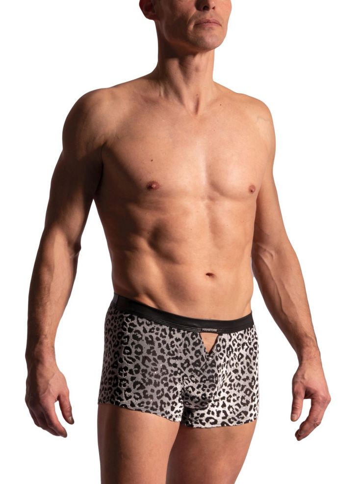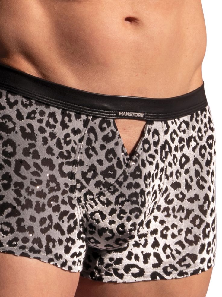 Een zeer opvallende short uit de M2235 Collectie van Manstore. De stof is zijdezacht en voelt als fluweel. Het luipaardmotief met een kleine glitter erin maakt deze boxer zeer opvallend. Tenslotte kan de driehoekige opening aan de bovenkant ook heel stout gebruikt worden. Een echte showmaster dus!