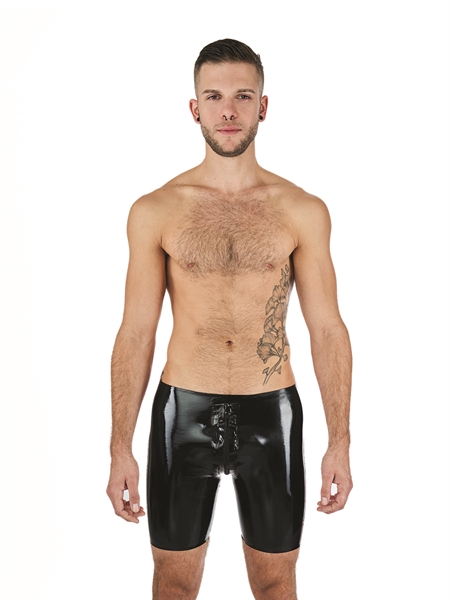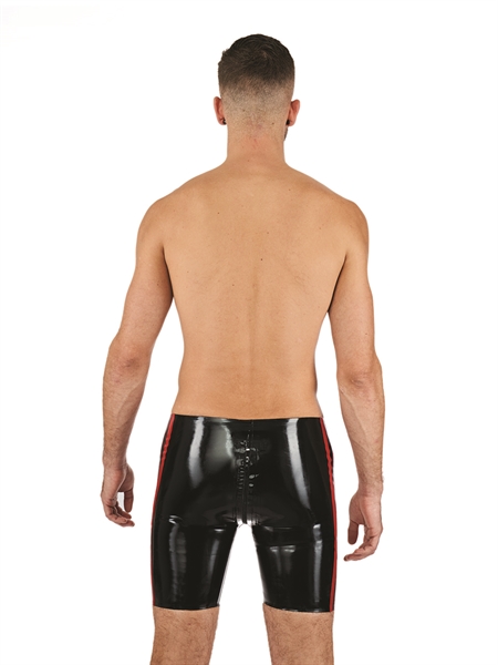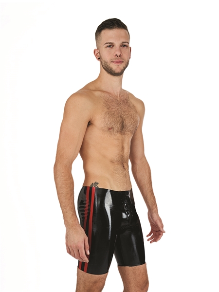 De latex Fucker-short heeft een volledige 3-wegritssluiting voor gemakkelijke toegang. Deze rubberen shorts zijn 0,4 mm dik en hebben een geweldige pasvorm. Als je dus op zoek bent naar een sexy korte short, dan zijn deze perfect voor jou. Ze zijn ontworpen met een iets hoger ruggedeelte voor een perfecte pasvorm. Deze trunks zijn voorzien van een rood gekleurde zijbekleding. Deze rubberen trunks zijn geweldig te combineren met b.v. een rubberen borstharnas of een latex shirt.