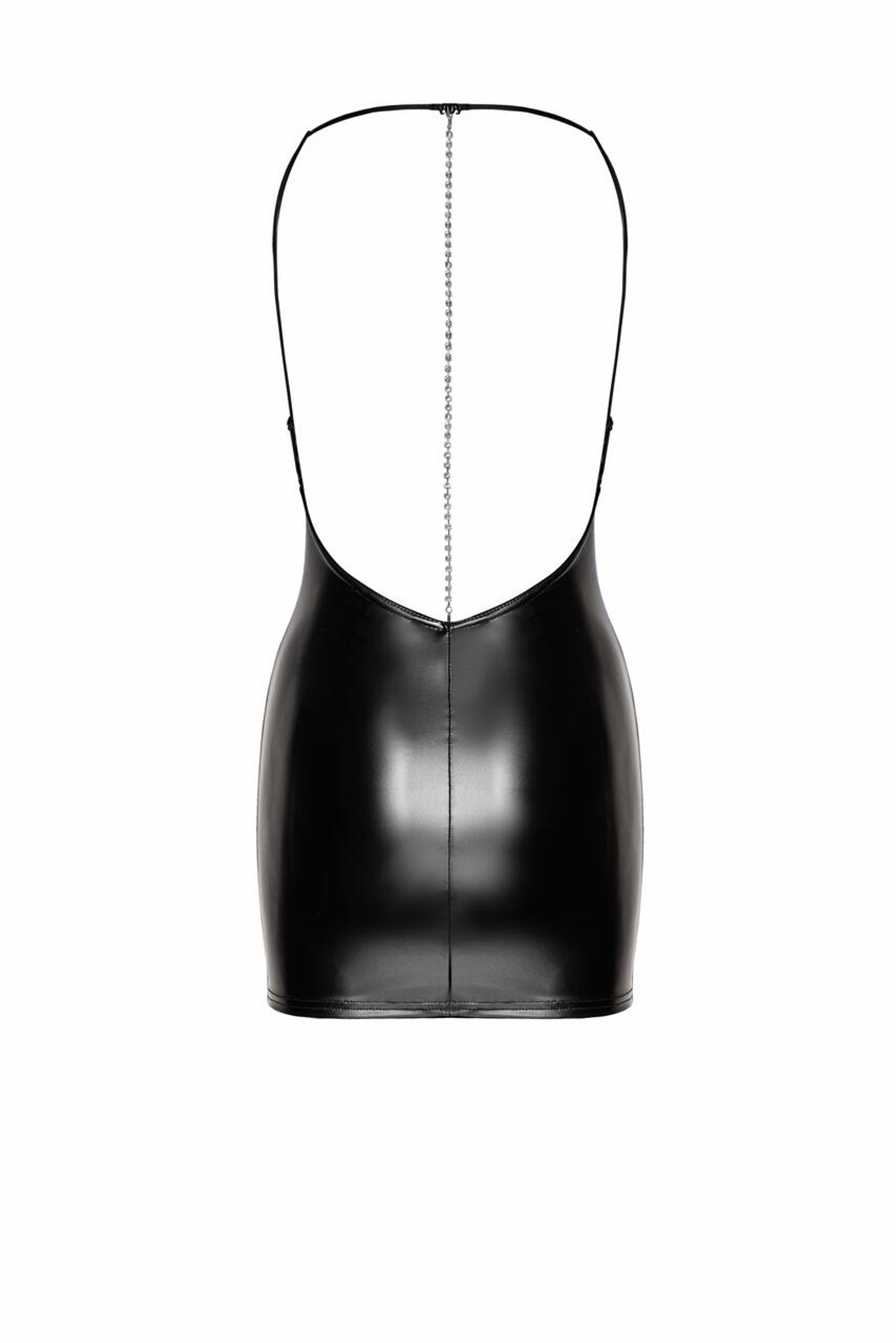 Stijlvol en sexy mini jurkje met een waterval halslijn. De achterkant trekt al je aandacht door de blote rug met de opvallende strass ketting.