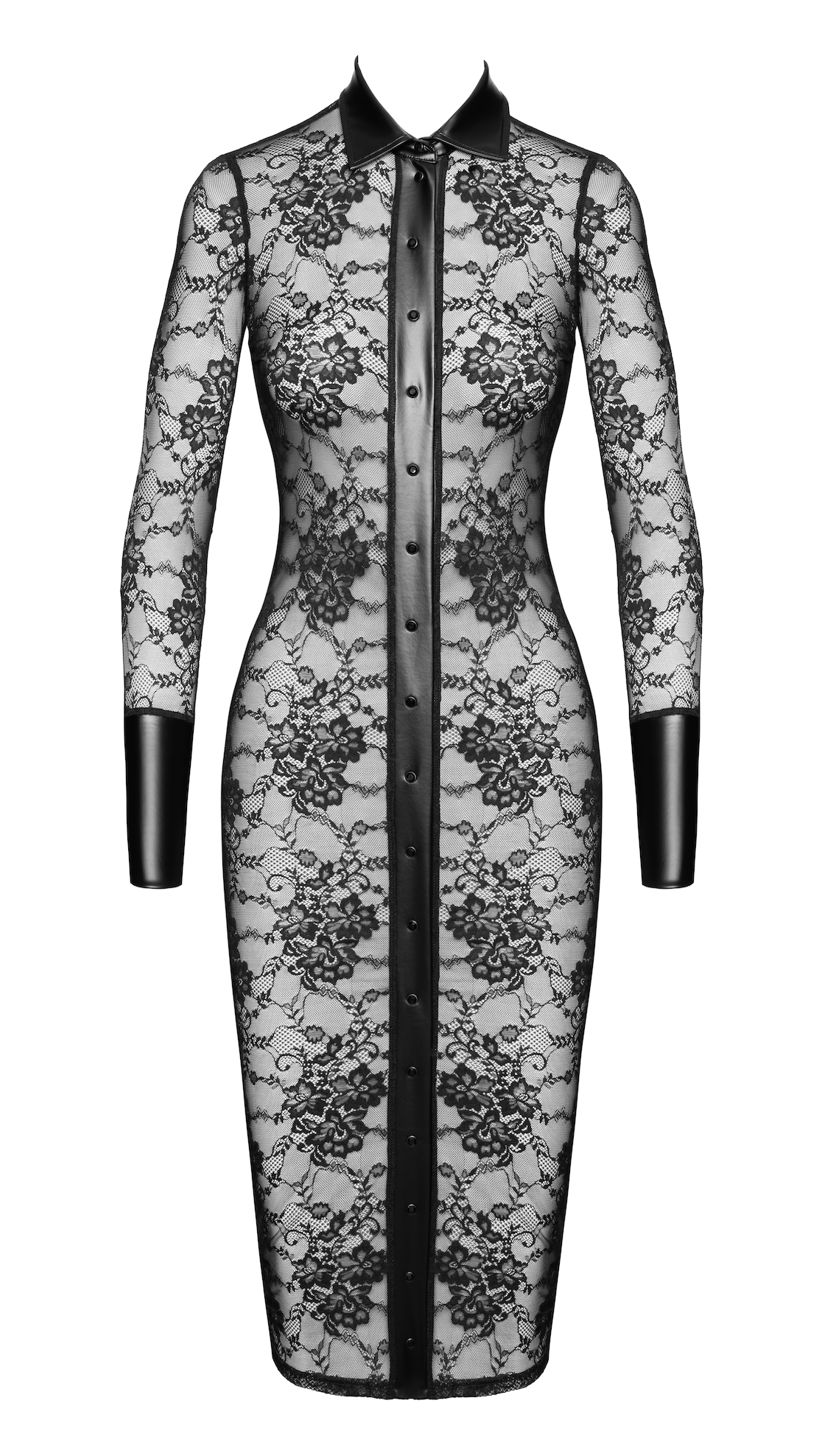 Draai hoofden om in deze elegante midi jurk die delicate kant moeiteloos combineert met gedurfde, gestructureerde accenten. Gemaakt van zacht, elastisch kant met een powerwetlook knooplijst voorzien van zwarte strass-drukkers, mixt deze look vrouwelijke finesse met een subtiele edge. De stof beweegt soepel met je lichaam mee en volgt je vormen voor een flatterende, comfortabele fit. De overhemdkraag en brede powerwetlook manchetten geven een gepolijste, moderne finish, terwijl de midi lengte elegantie en zelfvertrouwen uitstraalt. Perfect voor avonden of events waarop je indruk wilt maken: verfijnd en onweersaanbaar