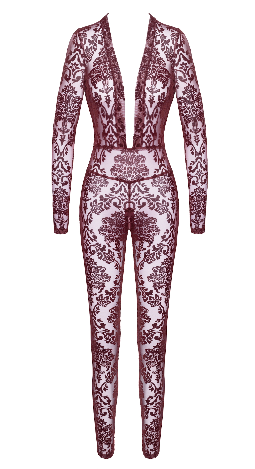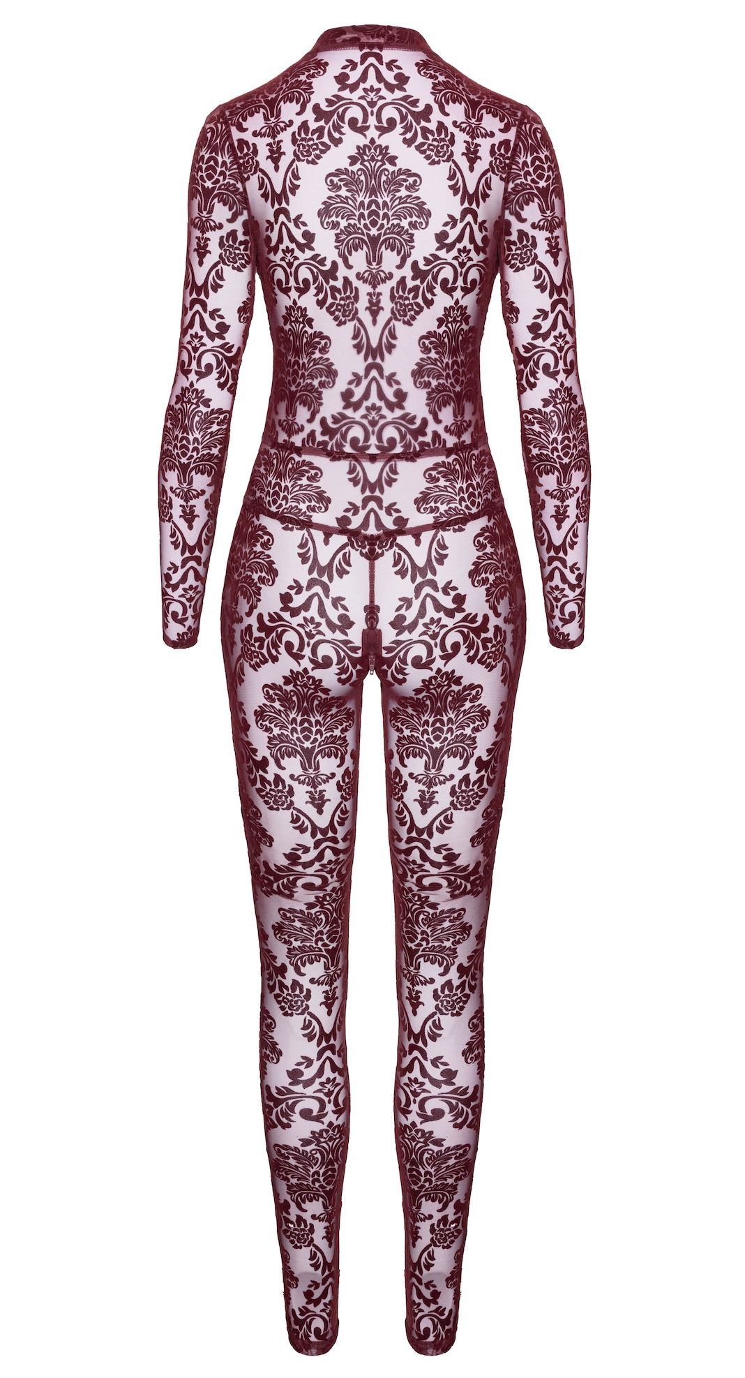 Bordeaux flocked gaas catsuit – Sensueel en verfijnd