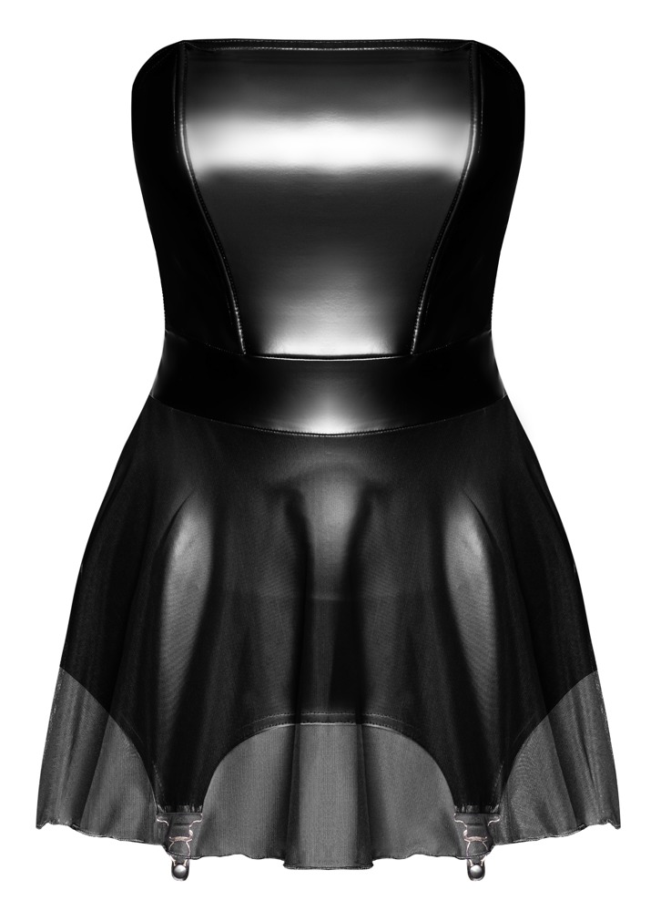 Laat niets aan de verbeelding over met deze verleidelijk strapless mini dress van Noir Handmade. Het bovenstuk van glanzende powerwetlook omsluit je lijf als een korset en vormt zich prachtig om je figuur. Onderaan komt het lichte, transparante tule rokje speels in beweging bij elke stap.