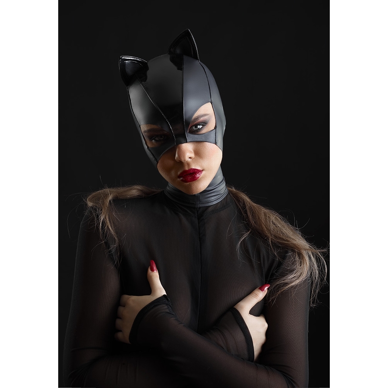 Super vrouwelijke en mysterieuze kattenmasker, de Beta Cagoule, van Patrice Catanzaro. Is heel subtiel en geraffineerd. Gemaakt van stretch wetlook en een deel lak. Het heeft een rits aan de achterkant.