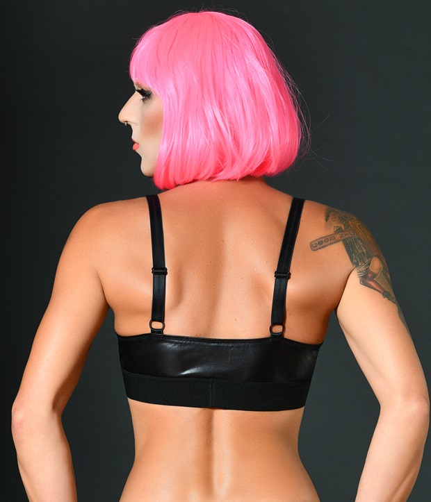 Deze BH is gemaakt van wetlook met een elastische band aan de onderkant, waardoor je deze heel makkelijk aantrekt. De cups zijn afgezet met een brede strook kant.