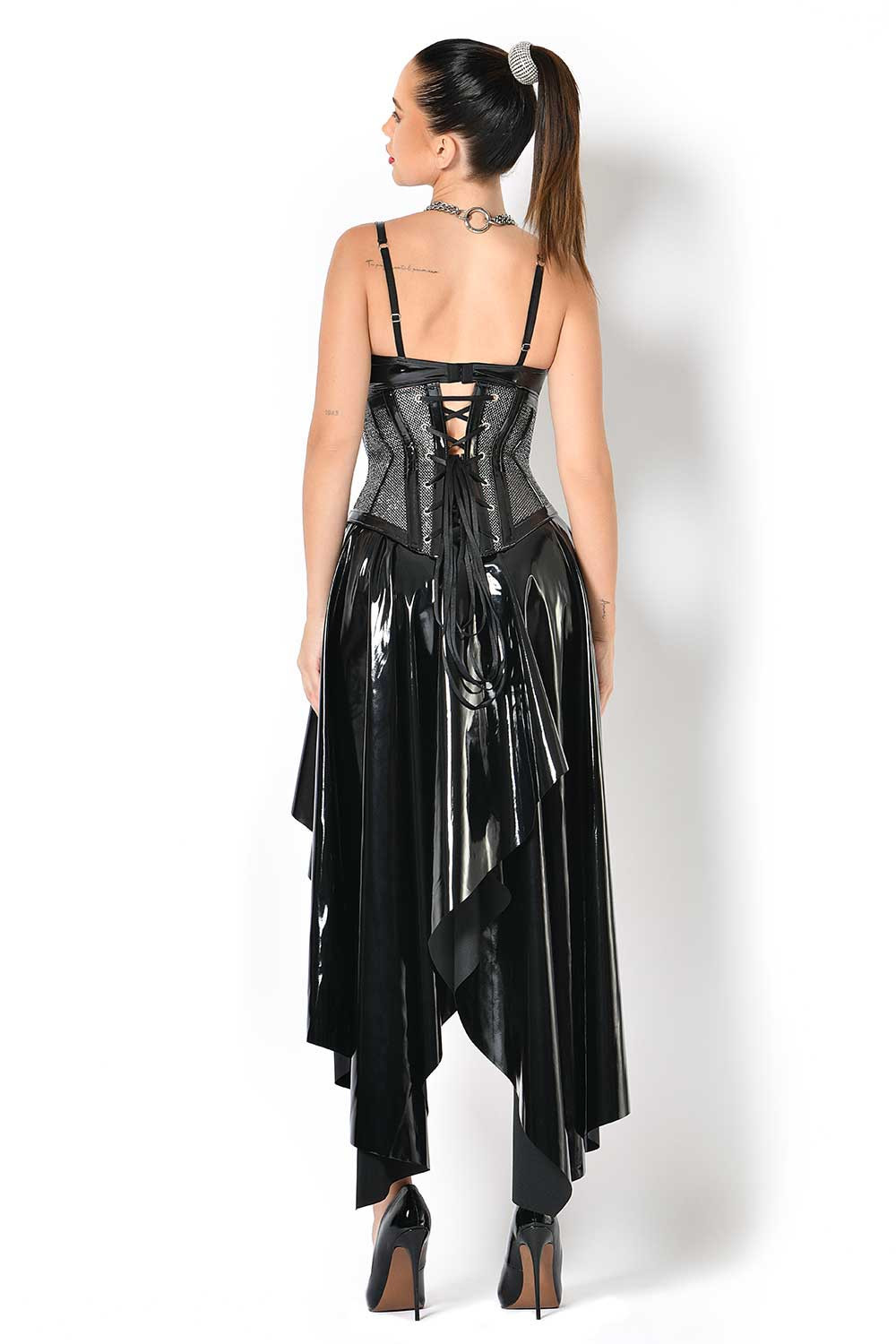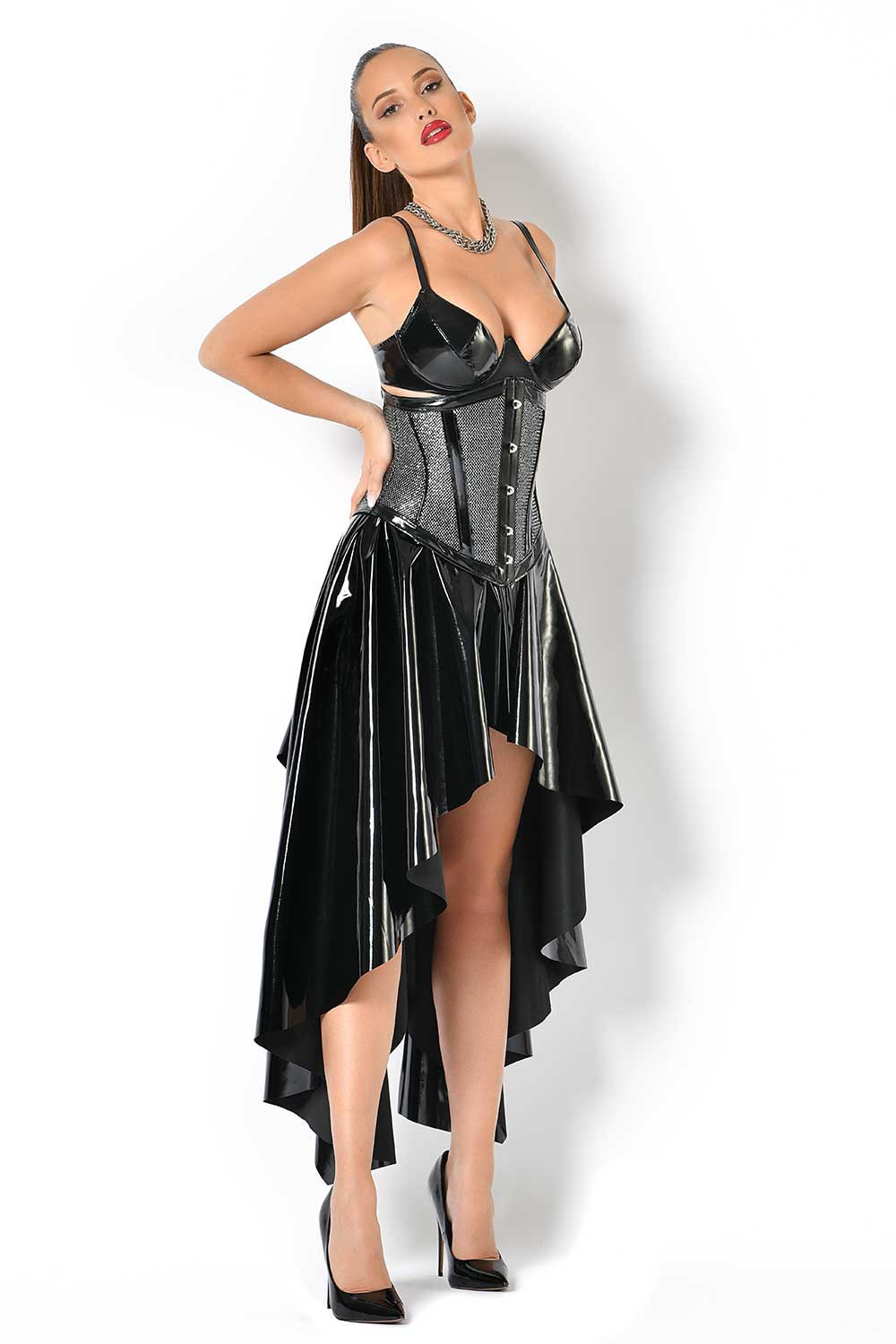 Combineer dit underbuste corset met lak, wetlook of lingerie items voor een krachtige Catanzaro-look. Op de sfeerfoto is te zien hoe dit model gedragen wordt met de O-rok en Sam BH van lak.