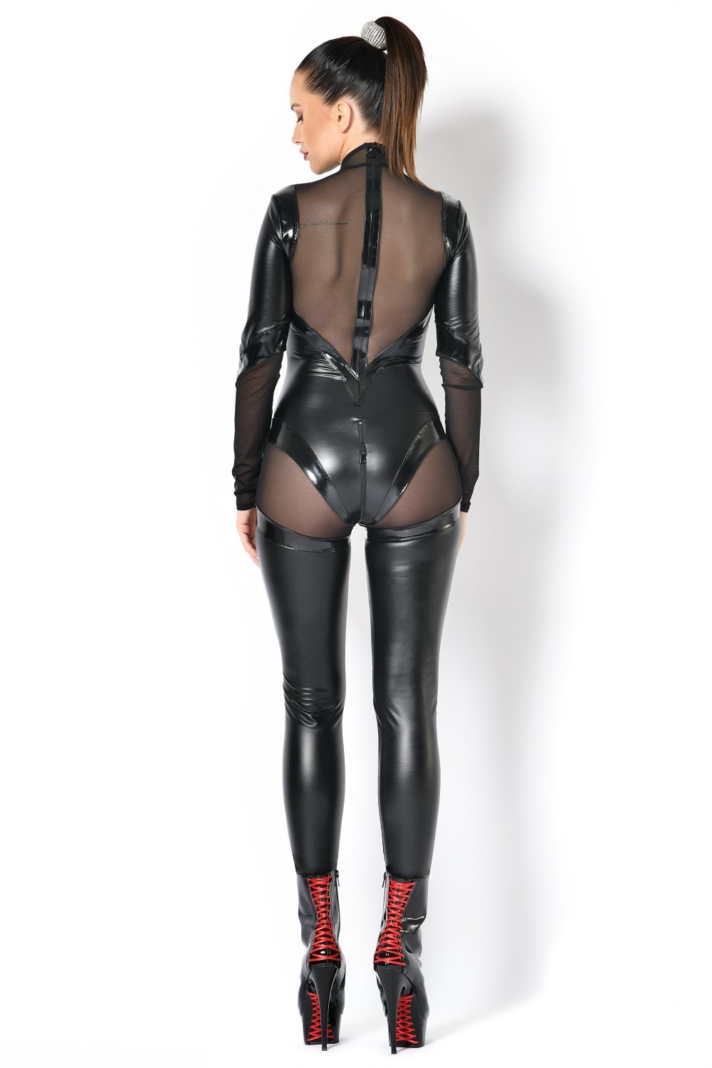 De diepe V-hals van transparant mesh wordt geaccentueerd door een opvallende vinyl omlijsting die de vrouwelijke vormen prachtig benadrukt. Lange mouwen combineren verschillende materialen voor een spannend contrast tussen glans, structuur en doorschijnendheid. De open rug met mesh zorgt voor een extra verleidelijke touch, terwijl strategisch geplaatste vinylpanelen de lichaamslijnen perfect volgen.