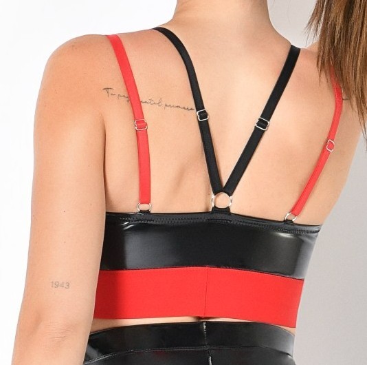 Onder de buste zorgt een brede rode elastische band voor een krachtig kleurcontrast én stevige ondersteuning, zonder gebruik van sluitingen. De dunne verstelbare schouderbandjes zijn afgewerkt met rode en zwarte details, en zorgen voor een comfortabele en persoonlijke pasvorm.