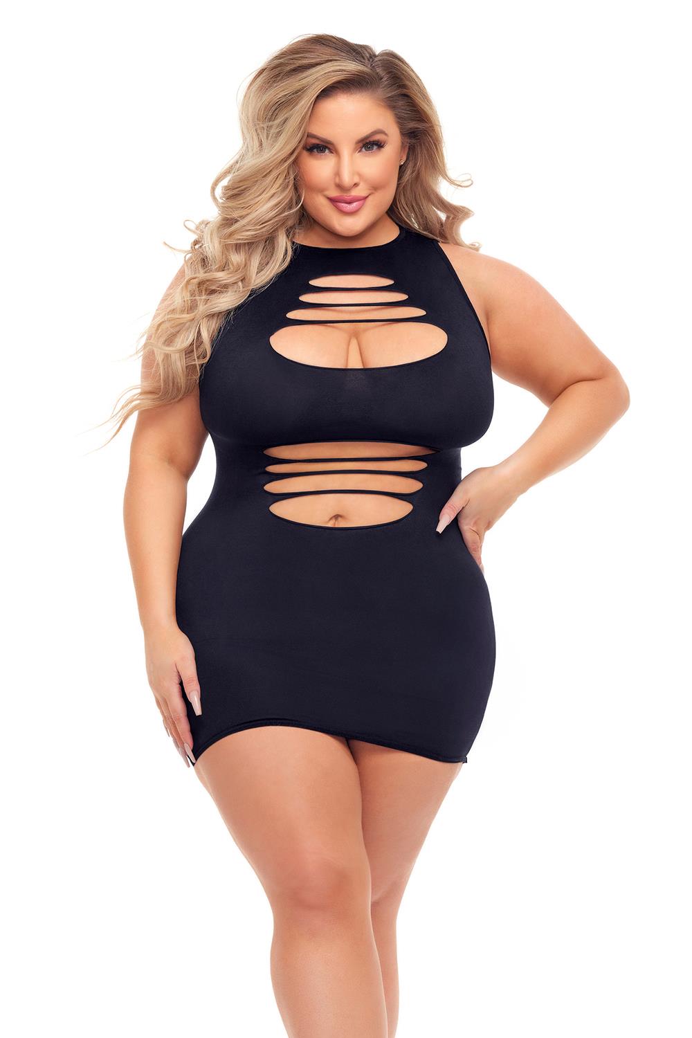 Sexy bodystocking jurkje met aan alle kanten spannende opengewerkte inzetten. Dit halterjurkje is gemaakt van naadloze spandex.