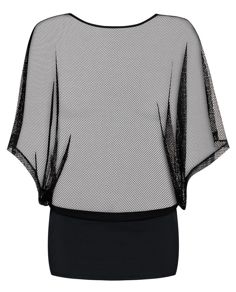 Mini-jurk met een transparant, wijdvallend visnet bovenstuk en een nauwsluitende rok. Kan ook goed gecombineerd worden met een mooie bh. Een bijpassende string zit erbij.