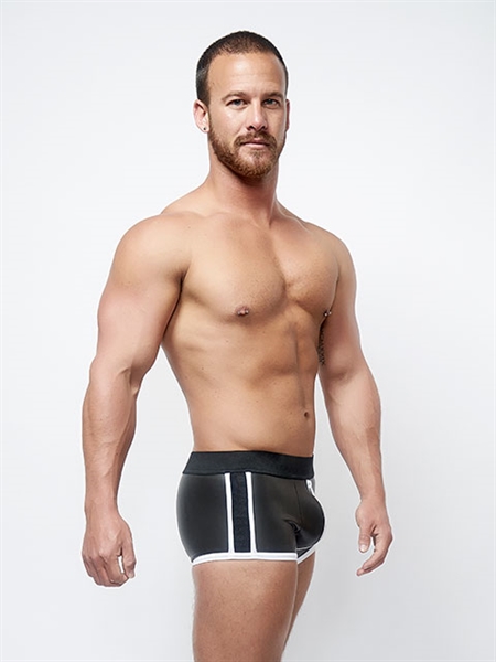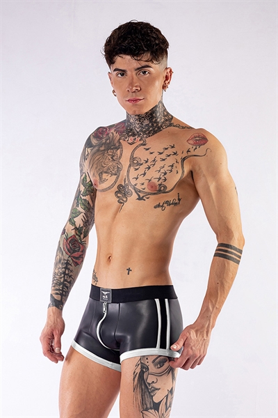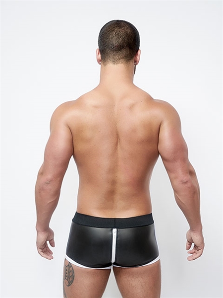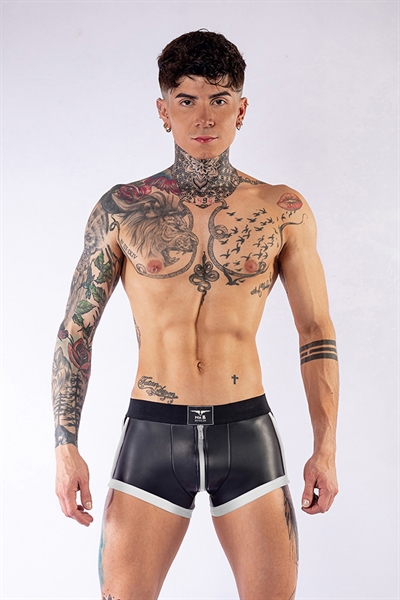 Deze short met witte rits is van een hoge kwaliteit. De witte rits is 3-zijdig. De short heeft speelse witte banen aan de zijkant en de pijpjes zijn wit afgezoomd. Deze kleur wit reflecteert in het donker!