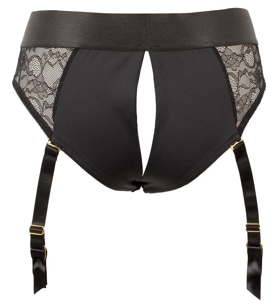 Voorzijde is dubbellaags met een discreet stretch-houder voor eenvoudige plaatsing van de meegeleverde dildo met zuignap. Ook andere dildo’s/vibrators met zuignap (Ø max. 4 cm) passen in de houder. Aan de achterkant zit een uitnodigende uitsnede boven de billen. De jarretels zijn verstelbaar én volledig afneembaar.