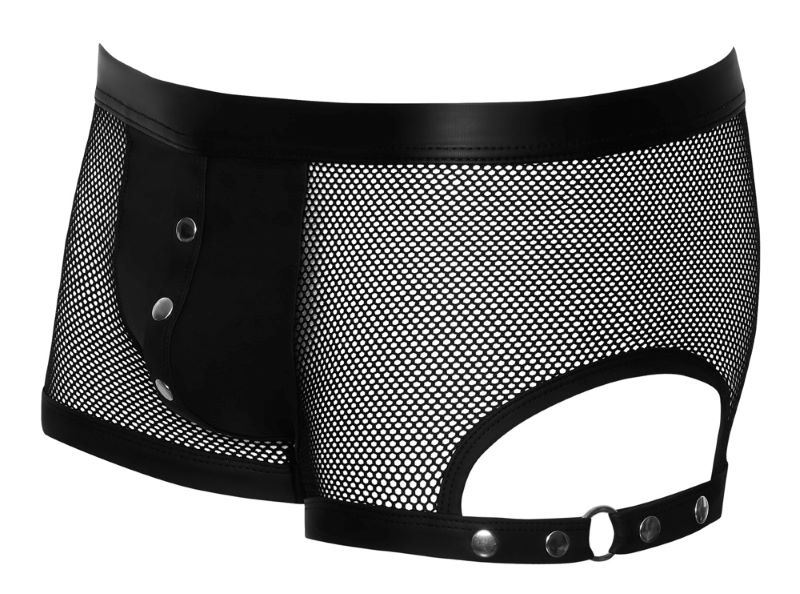 Sexy short in visnet met neopreen look. Deze Svenjoyment boxer is gemaakt van een mix van spannende transparante netstof en rekbaar mat wetlook op de gulp. Om de benen zitten verstelbare straps.