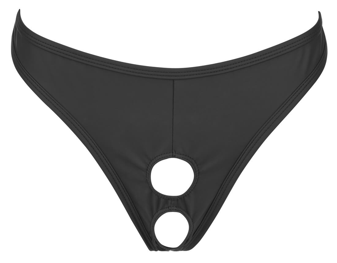 De string heeft uitsparingen voor penis en testikels. Deze kleine openingen zijn niet alleen om de zaak te presenteren, maar ze zijn ook stimulerend zoals bij een cockring.