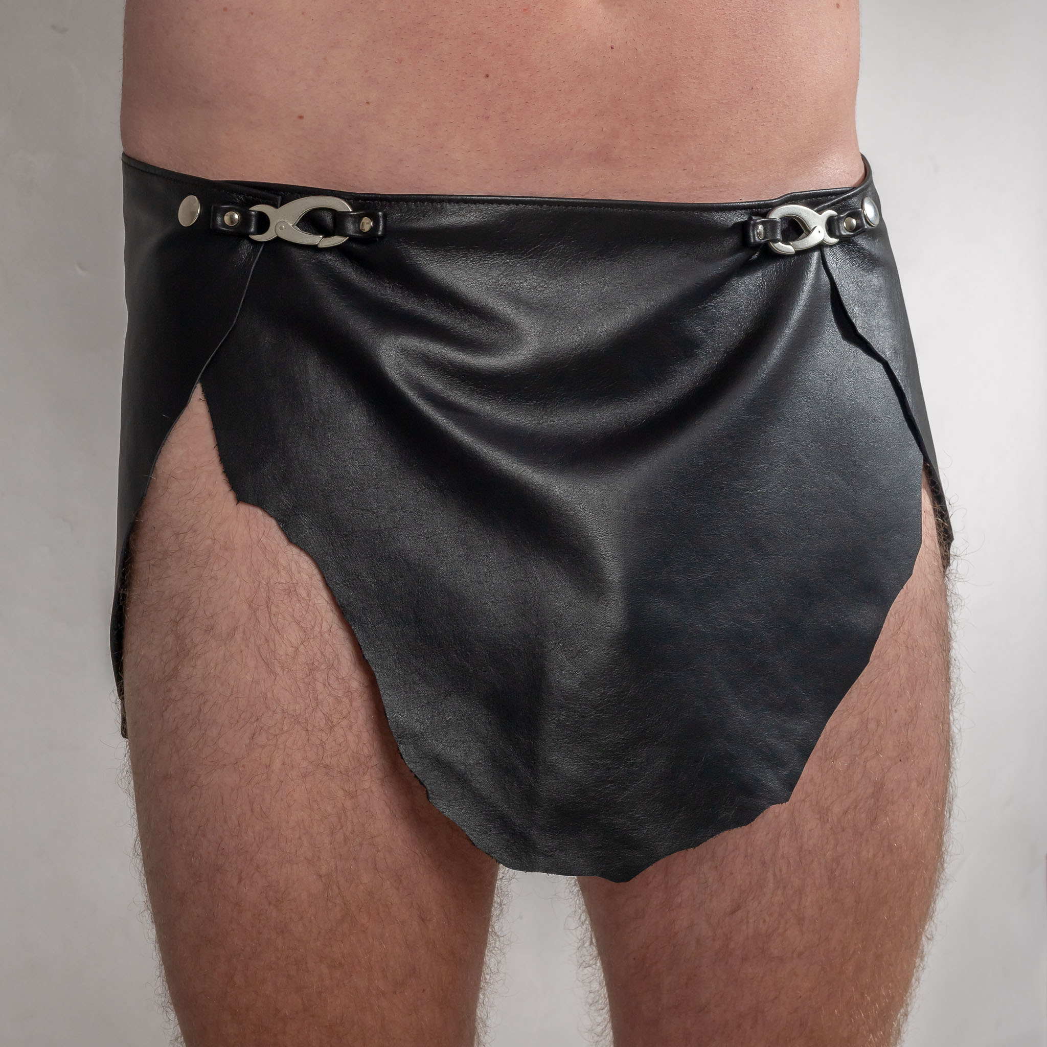 Stoere rok van asymmetrisch gesneden flappen. Het sluit aan de bovenkant met 2 haken.