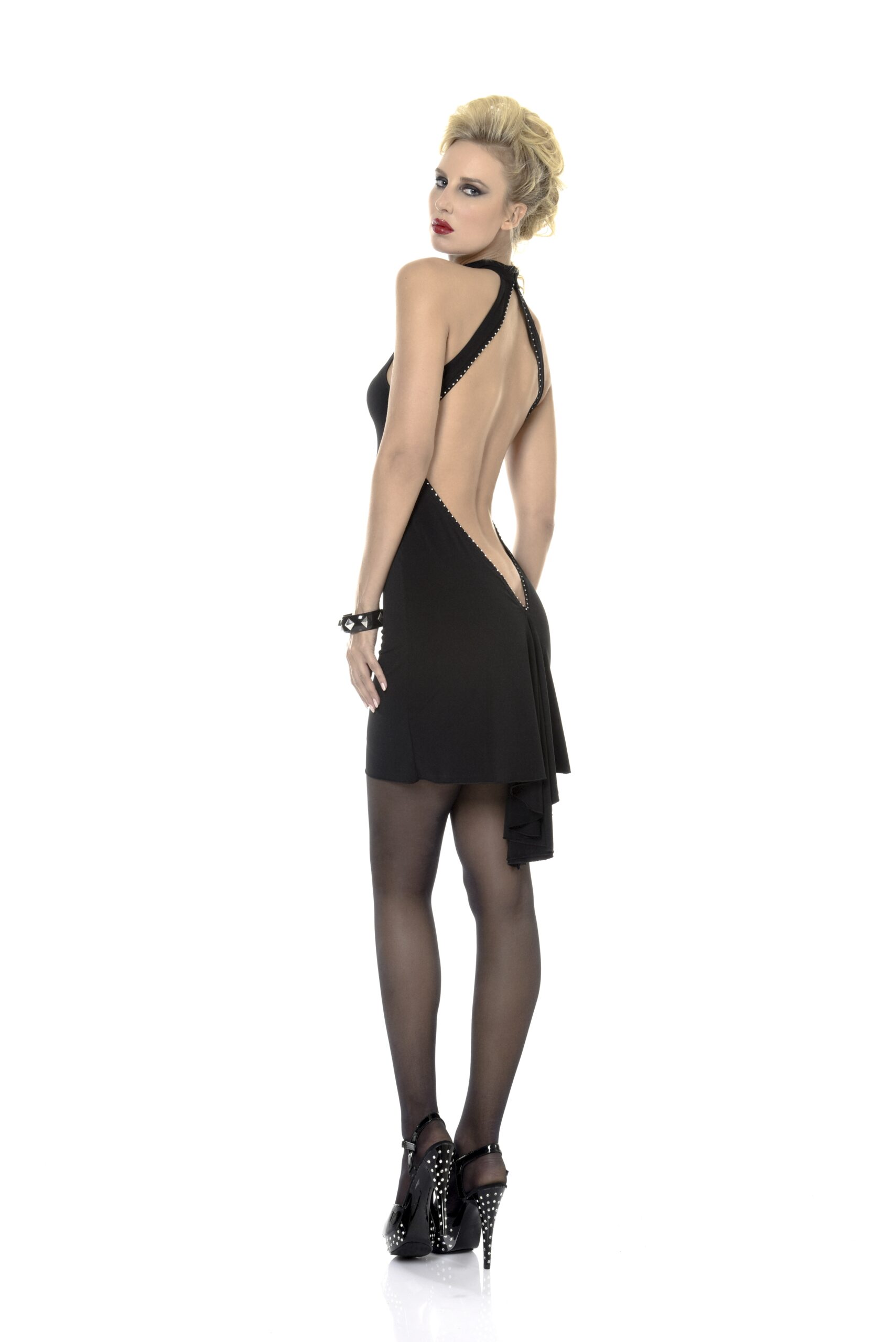 Geweldig mooie partydress met een super spannende rugpartij. De rug is bloot tot aan de billen. De achterkant is volledig afgezoomd met strass steentjes. De jurk heeft ook nog een sleepje aan de achterkant voor een dramatisch effect. Aan de voorzijde ben je door de hoge halslijn een chique dame, aan de achterkant laat je zien wie je werkelijk bent, een super sexy vrouw.