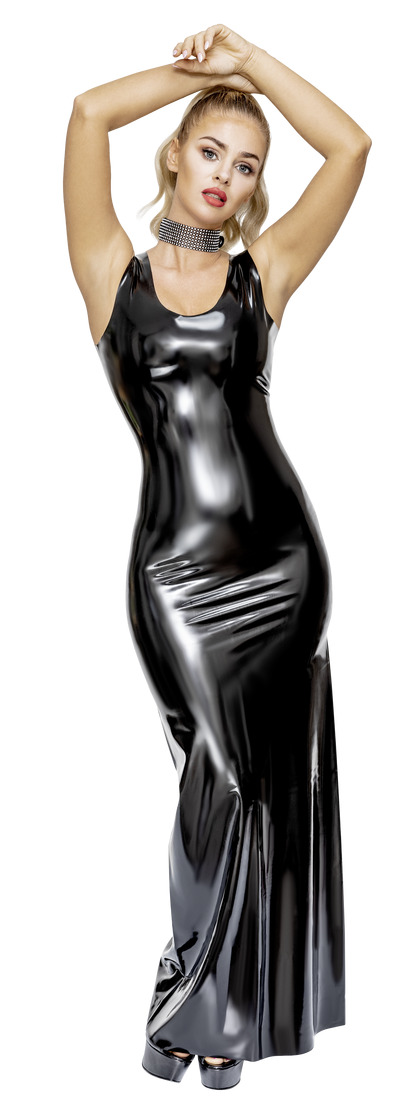 Deze jurk is een getailleerde maxi jurk gemaakt van black natural latex en heeft een elegante hals en neklijn.