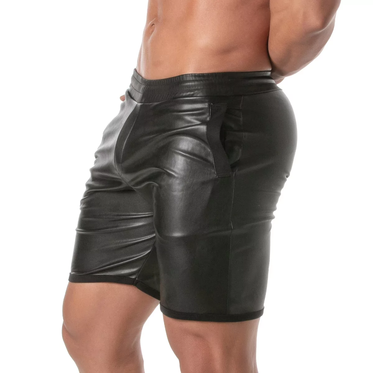 Sexy en stoere short van kunstleer. Deze short heeft 2 steekzakken waarvan 1 met rits afsluitbaar. De band is elastisch en heeft aan de binnenkant een veter om dicht te knopen. Ideaal om zo te dragen of om te combineren met een stoer shirt. De gulp heeft drukknopen, maar dat vinden wij meer voor de sier.