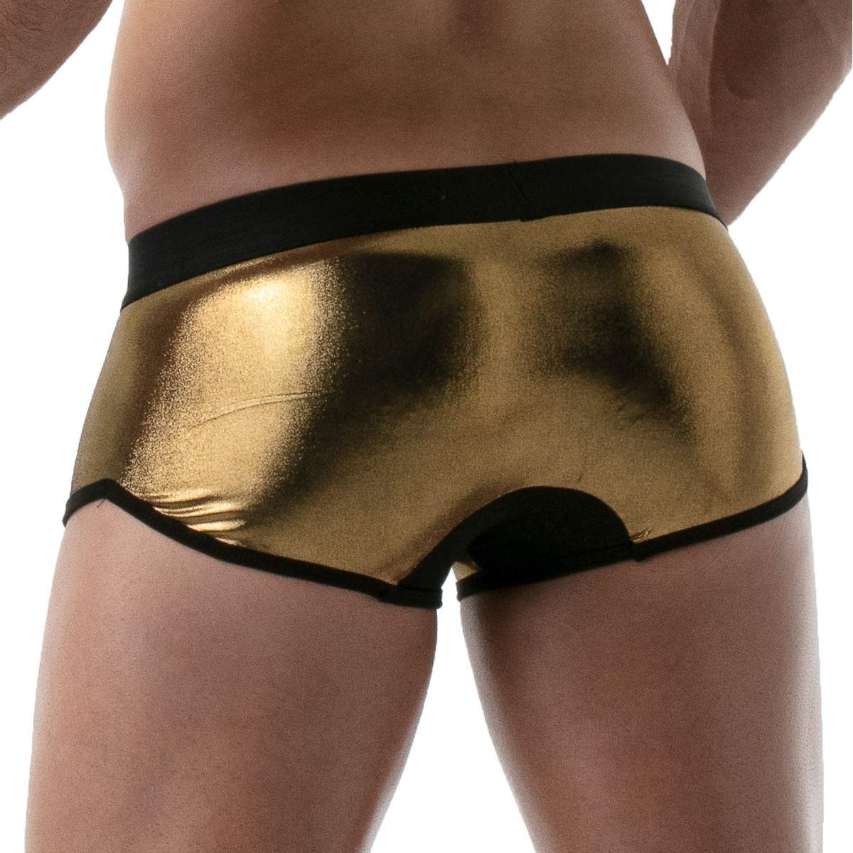 Voor de retro geïnspireerde collectie heeft het ontwerpteam van TOF PARIS de klok teruggedraaid, alles uit de kast gehaald en een super sprankelende stijl naar feestkleding gebracht. Deze sexy low-waisted short heeft een heel glimmende metallic gouden look afgezet met een zwarte elastische band en zwarte biesjes.