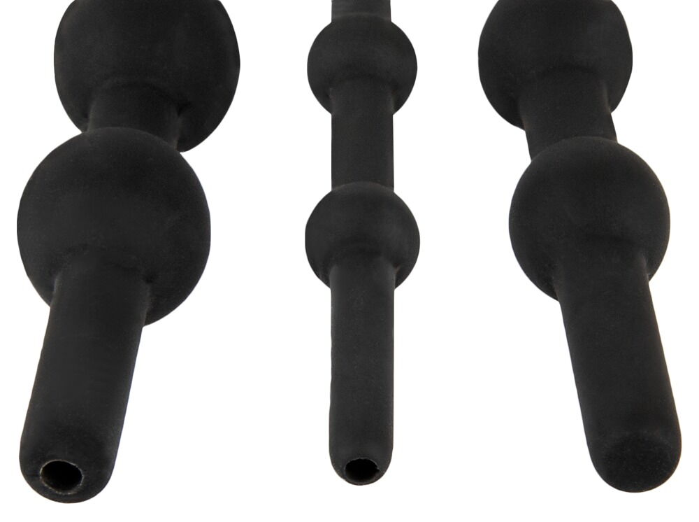 Penisplug-trainingsset met 3 verschillende dilatoren. Ze zijn alle drie gemaakt van fluweelzachte siliconen en hebben elk stimulerende kralen in verschillende diameters. Elke kraaldilatator heeft een afgeronde punt en een terugtrekring voor eenvoudig inbrengen en verwijderen. Ze zijn ook buigbaar en flexibel voor zacht, comfortabel gebruik en optimale aanpassing.