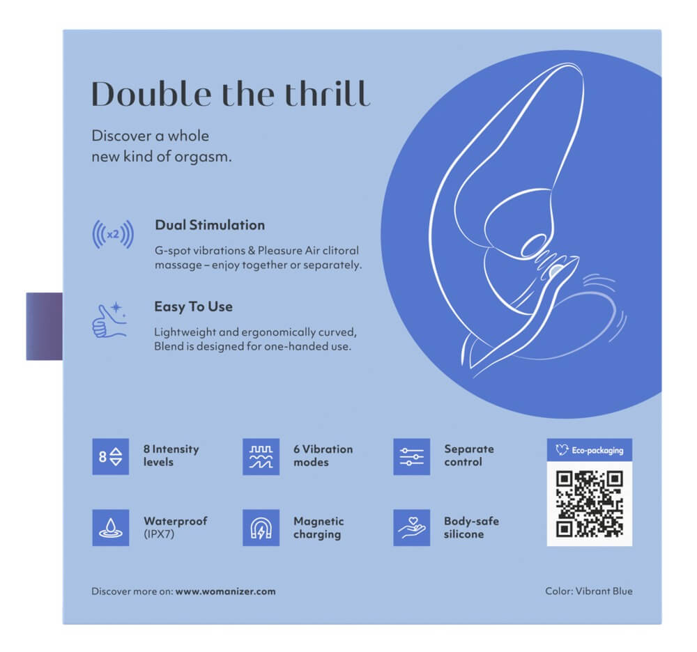 Double the Thrill: De revolutionaire Womanizer Pleasure Air™ Technology is gecombineerd met krachtige G-spot stimulatie – dat is de Blend van Womanizer. Het klassieke Womanizer clitorisopzetstuk bevredigt de vrouwelijke clitoris terwijl de vibrerende arm, die zich perfect aanpast aan de vrouwelijke contouren, de G-spot op een heerlijke manier stimuleert.