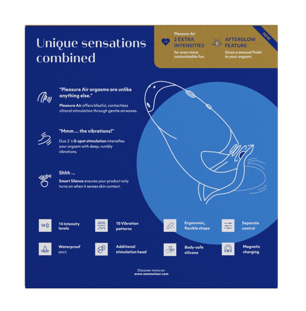 De revolutionaire Womanizer Pleasure Air™ Technology gecombineerd met krachtige G-spot stimulatie – dat is de DUO 2 van Womanizer. Het klassieke Womanizer clitorisopzetstuk bevredigt de vrouwelijke clitoris terwijl de vibrerende arm, die zich perfect aanpast aan de vrouwelijke contouren, de G-spot op een heerlijke manier stimuleert.
